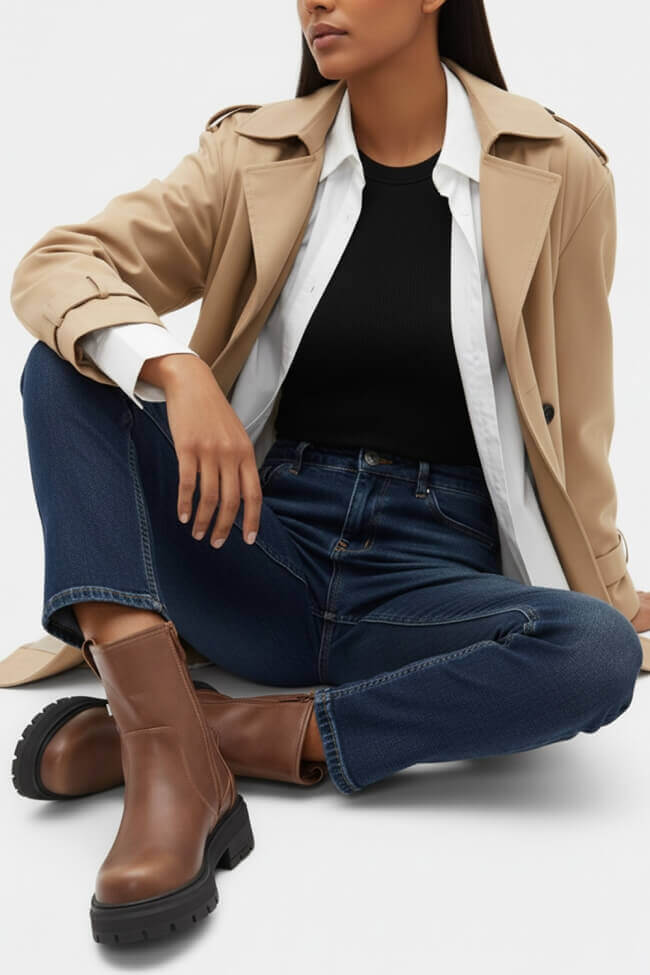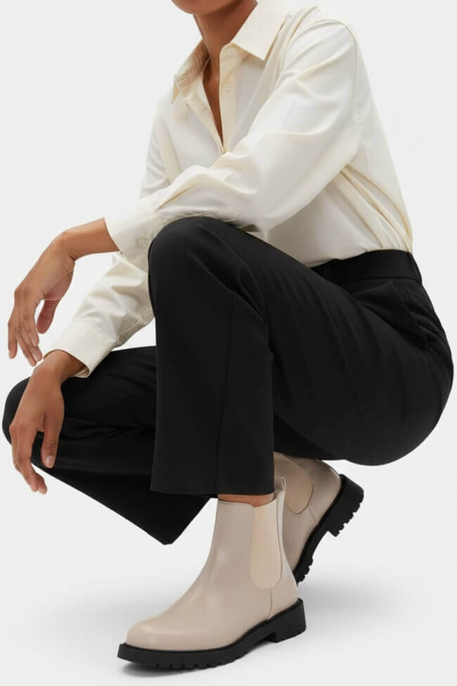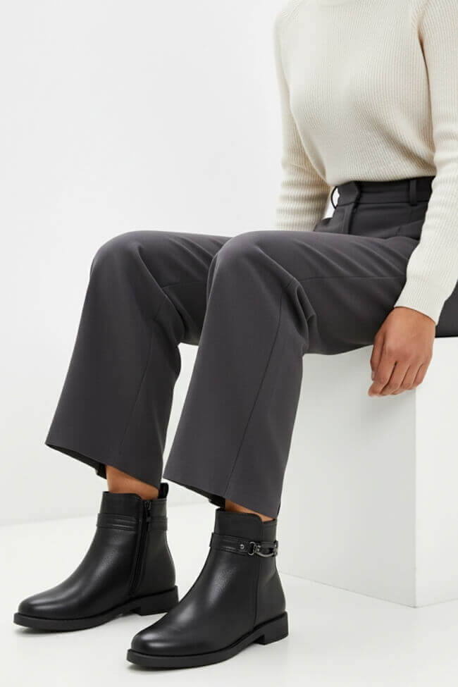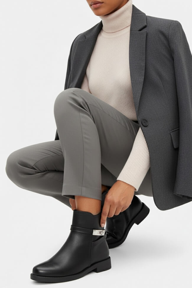 - Pentru Ținute Office: Transformă botinele flat în piesa de bază pentru birou, purtându-le cu pantaloni eleganți sau costume croite. O botină de culoare neutră va oferi o notă profesională look-ului.