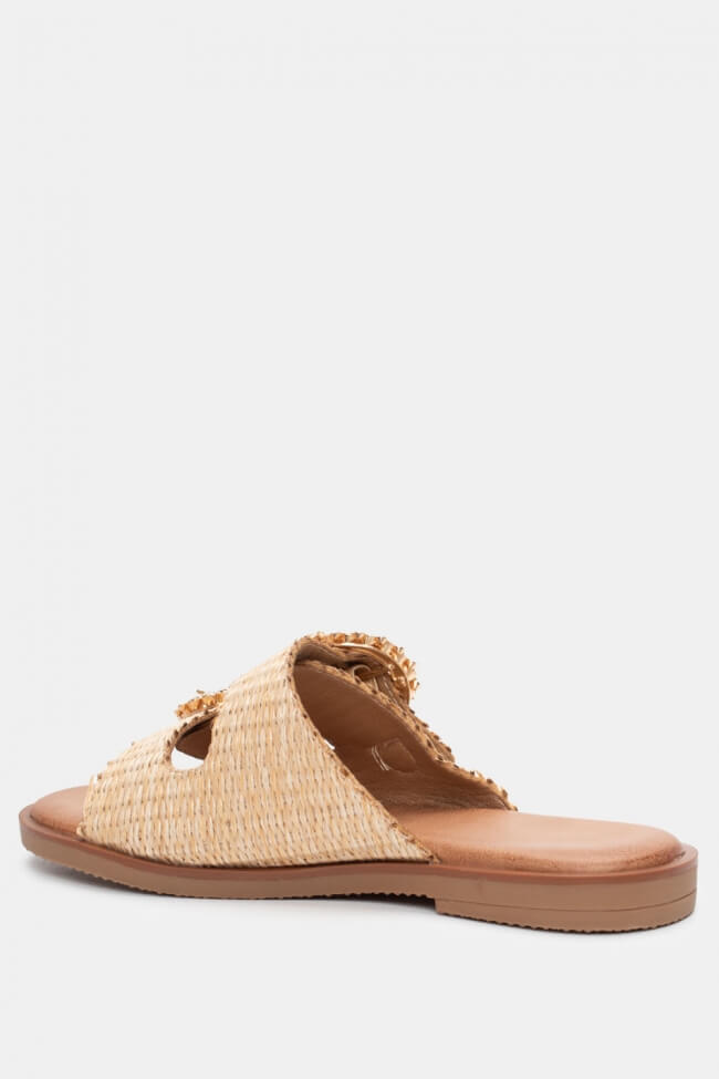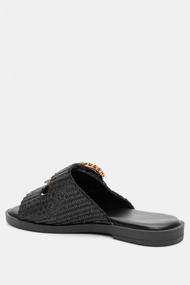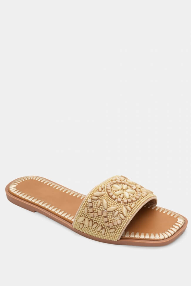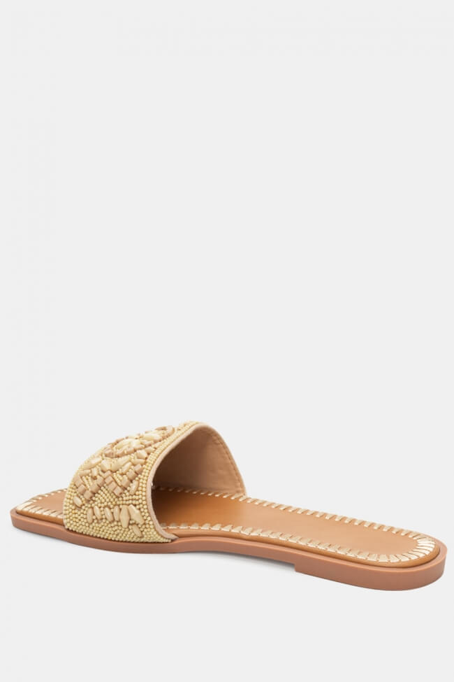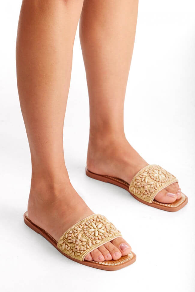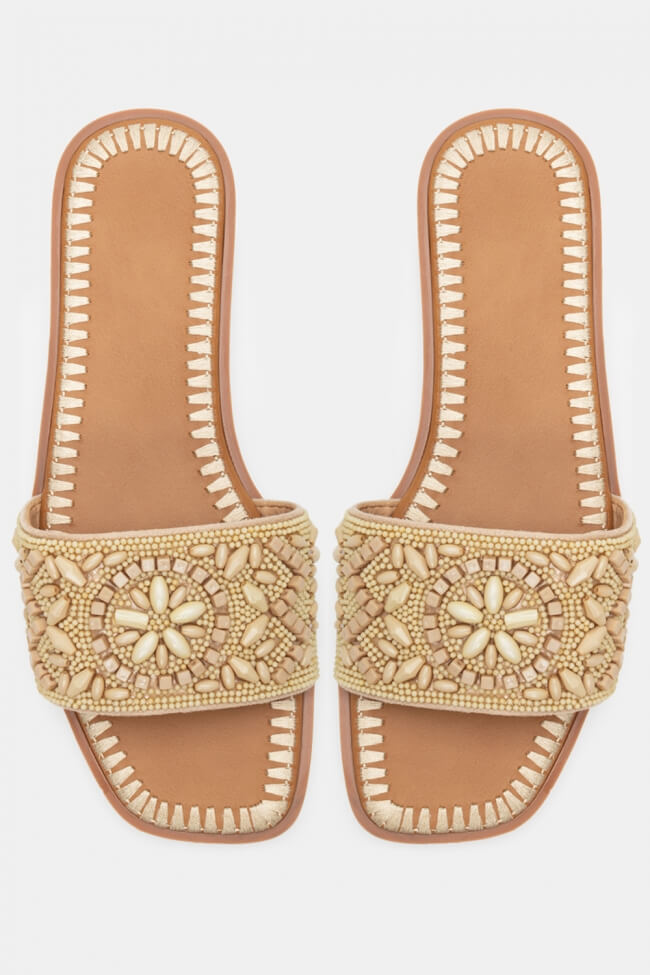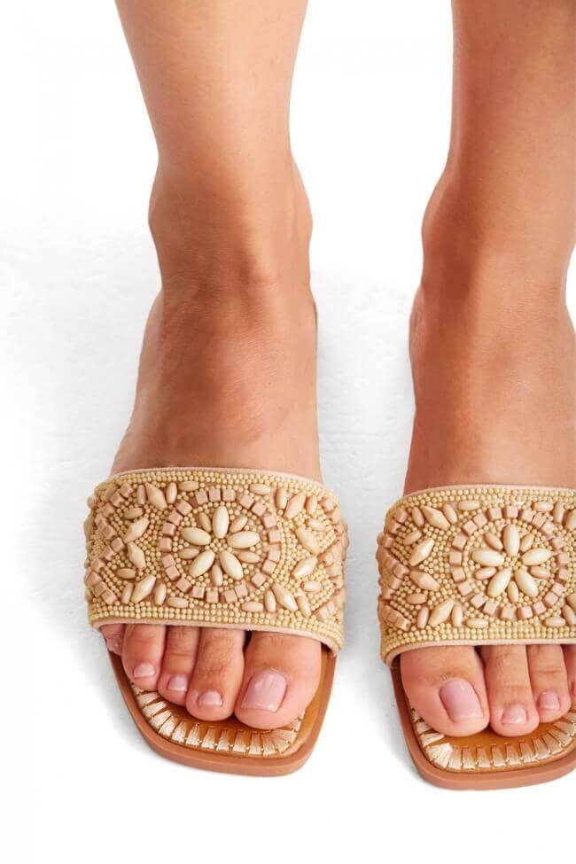 #4. Sandale plate Boho: Cu detalii croșetate sau din material textil, pentru o atmosferă mai relaxată și estivale, care se asortează perfect cu rochii lungi, kimono aerisit sau chiar pantaloni scurți cu o bluză din in largă pentru apariții absolut libere.