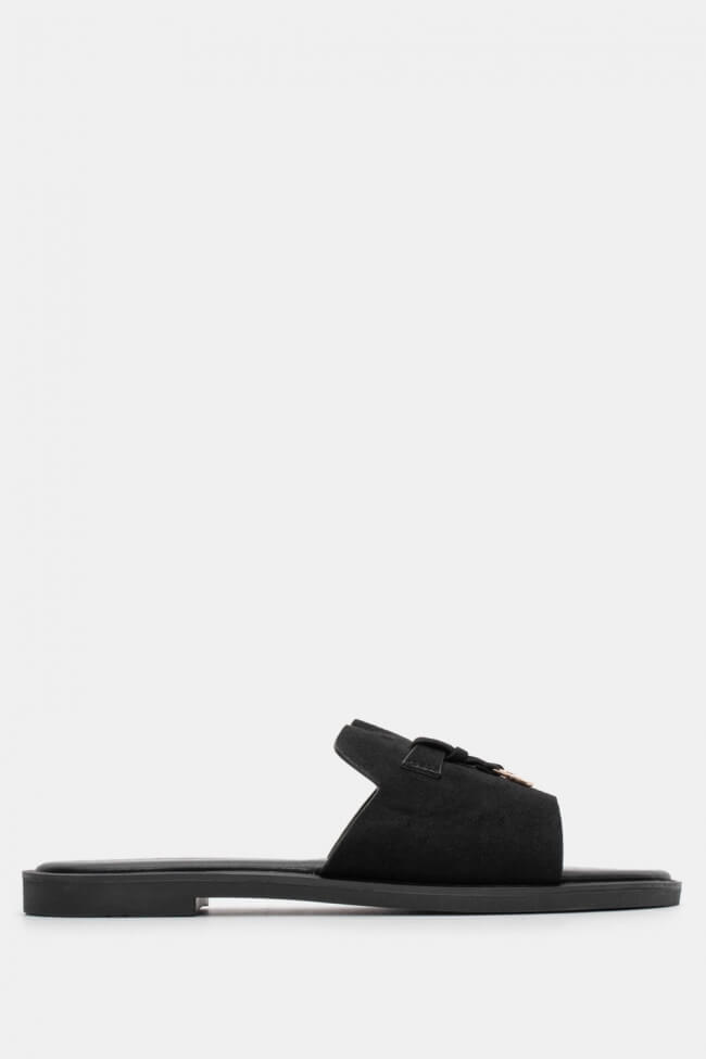 Pentru o dispoziție chic de seară, pantalonii negri cu un top din satin și sandale plate cu detalii metalice sunt alegerea ideală, în timp ce pentru eleganța urbană nu există o combinație mai elegantă decât un costum din in cu sandale minimalistice pentru confort și stil la fiecare pas.