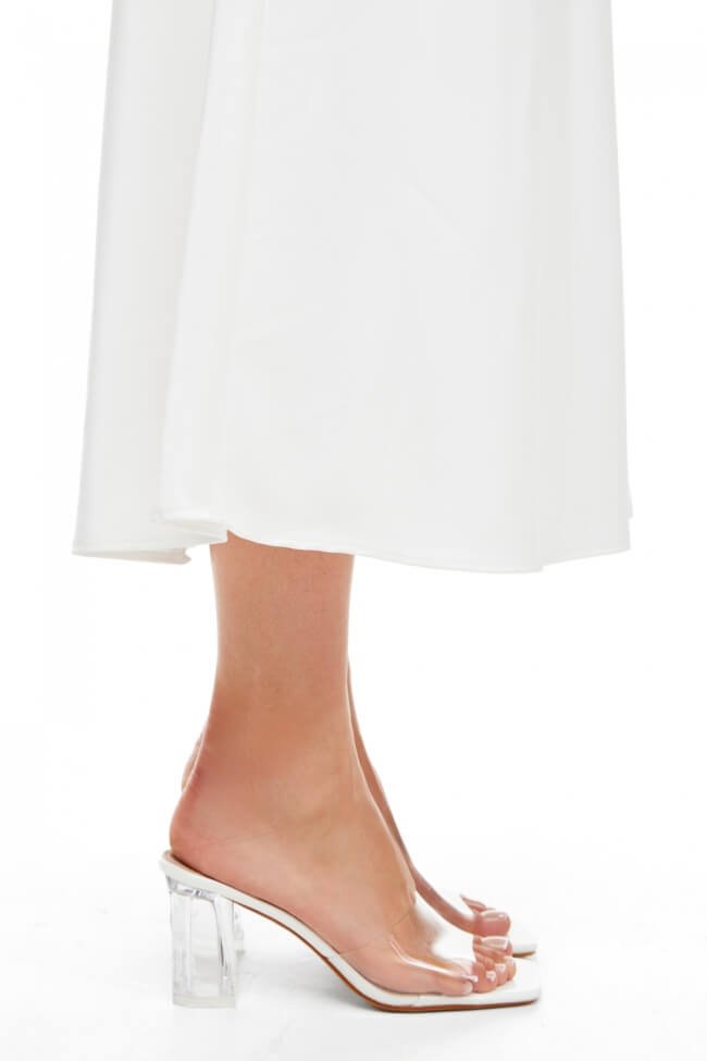 - Slip dress & sandals with chunky heels in soft color or with transparency for night-out.