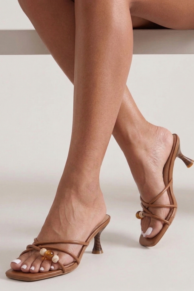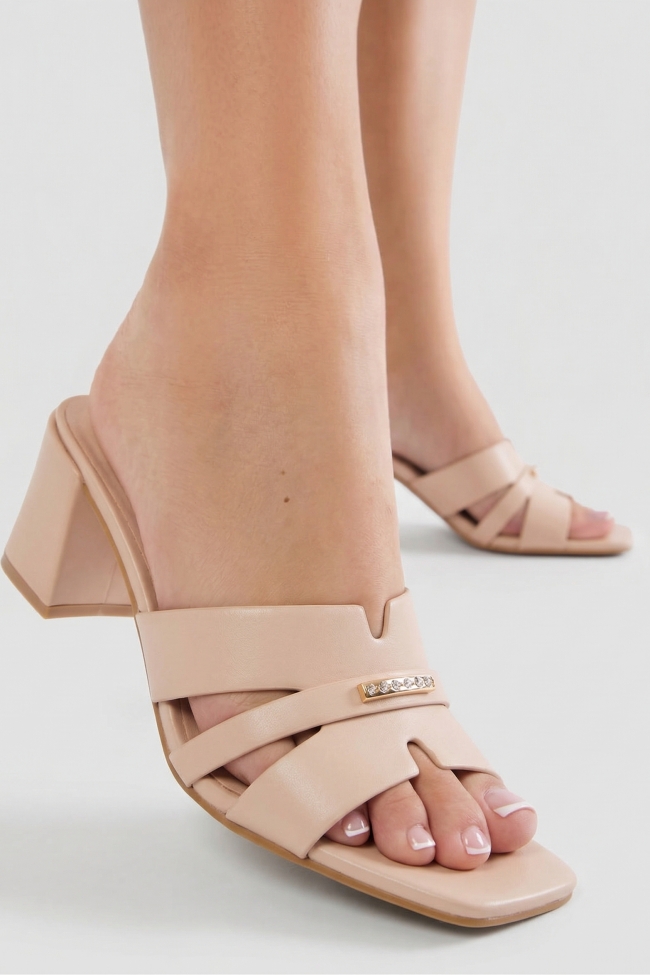- Choose high mules satin or leather with strappy details for sleek & feminine results.