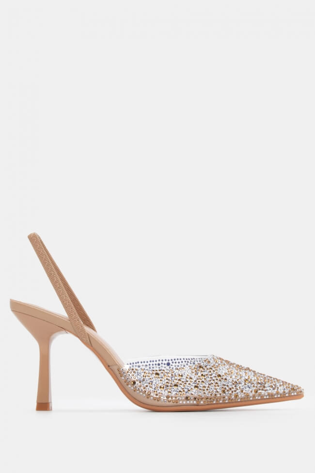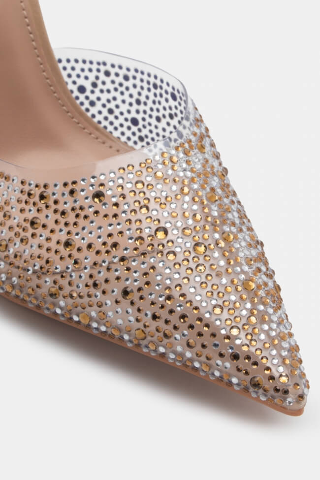 Mules cu transparență din stras și elastic