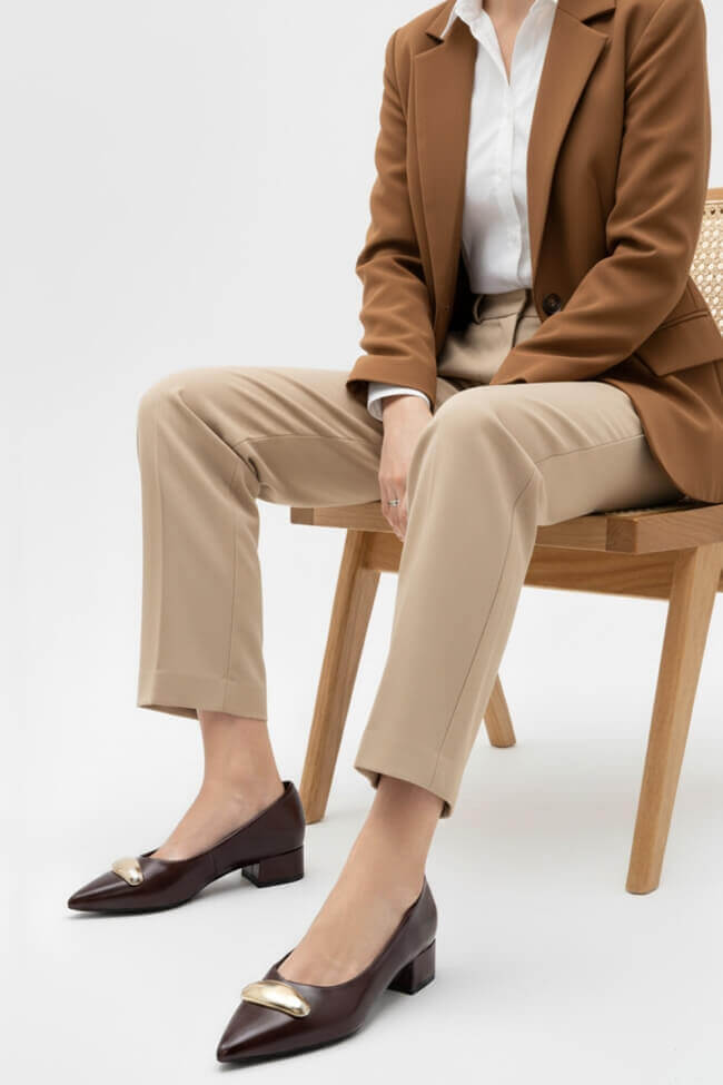 La birou: Pantofii cu toc jos sunt ideali pentru apariții profesionale, adăugând o notă elegantă fără a obosi picioarele. Se combină perfect cu pantaloni croiți și fuste pentru un look office elegant.
